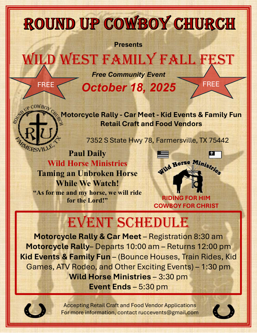 The Round Up Cowboy Church is a “come as you are” casual Cowboy Church. No matter what is going on in your life, you are welcome just as you are to worship with us. Scripture encourages us to be the example of Christ to all people, and to love others as ourselves without judgement. Our primary focus is to make our visitors feel at home and make them feel comfortable and that they belong when entering the church. If you don’t have a church home, come join us on Sunday mornings when we round ‘em up, circle the wagons, and worship our Lord and Savior with some awesome music and a horse kick’n message from Preacher John Spencer. The children are dismissed to ride off to children’s church while the adults enjoy the message from “The Range Boss”. We hope you will come and ride life’s trail with us. Hope to see you this Sunday @ 10:30 A.M.