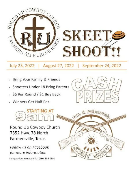 Skeet Shoot Saturday, August 27, 2022 9:00 AM 10:00 AM Round Up Cowboy Church 7352 TX-78, Farmersville, TX 75442, USA Farmersville United States (map) Google Calendar ICS Come and join us as we enjoy a morning of shooting. All are welcome; just bring your favorite shotgun and ammo. Shooters under 18 must bring their parents.Sign-up available at Round Up Cowboy Church day of shoot.$5 Per Round Entry Fee and $1 Buy BackWinner will receive Half the Pot