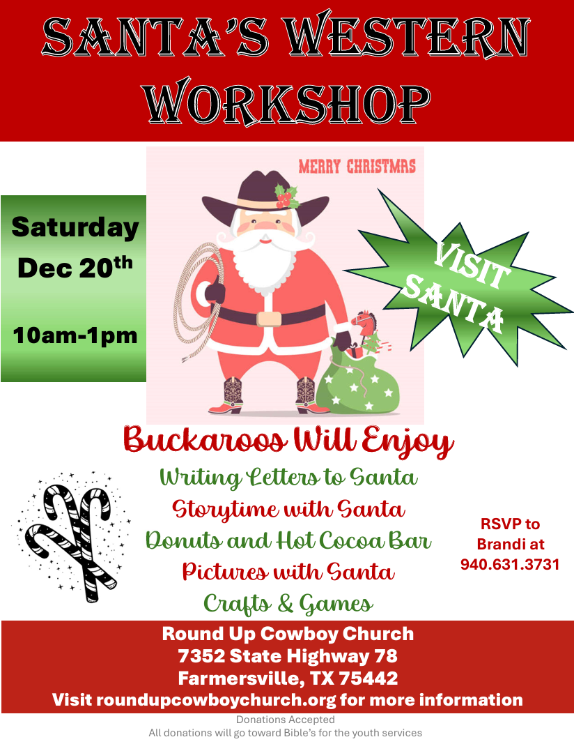 The Round Up Cowboy Church is a “come as you are” casual Cowboy Church. No matter what is going on in your life, you are welcome just as you are to worship with us. Scripture encourages us to be the example of Christ to all people, and to love others as ourselves without judgement. Our primary focus is to make our visitors feel at home and make them feel comfortable and that they belong when entering the church. If you don’t have a church home, come join us on Sunday mornings when we round ‘em up, circle the wagons, and worship our Lord and Savior with some awesome music and a horse kick’n message from Preacher John Spencer. The children are dismissed to ride off to children’s church while the adults enjoy the message from “The Range Boss”. We hope you will come and ride life’s trail with us. Hope to see you this Sunday @ 10:30 A.M.